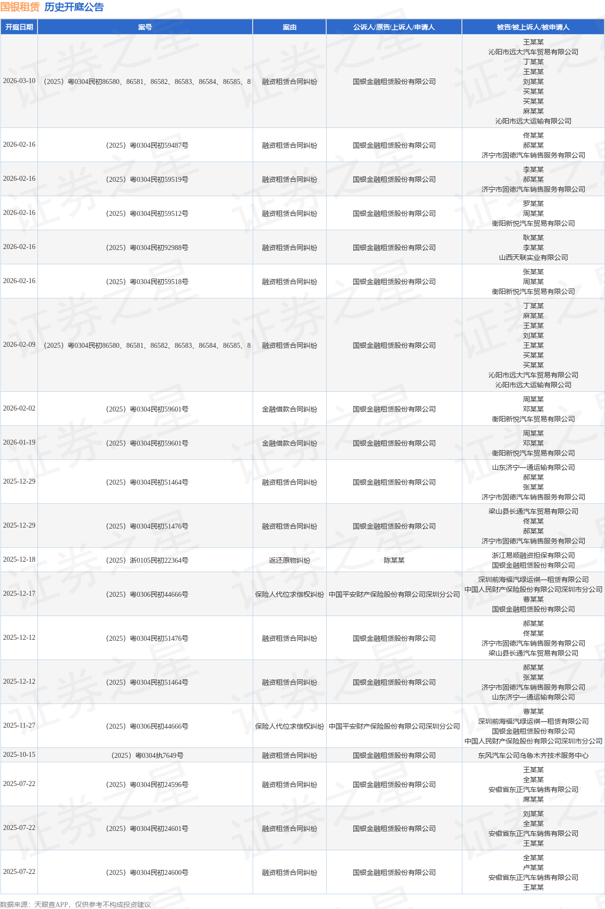 案号:(2025)粤0304民初59601号根据统计,近一年内以国银金融租赁股份有限公司为当事人的历史开庭公告有41则,其中案由为“融资租赁合同纠纷”的公告以34则居首,其次为“保险人代位求偿权纠纷”有2则,“金融借款合同纠纷”有2则。历史开庭公告(前20条)如下: