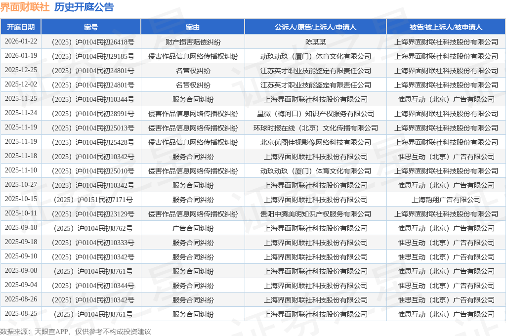 案号:(2025)沪0104民初29185号根据统计,近一年内以上海界面财联社科技股份有限公司为当事人的历史开庭公告有57则,其中案由为“服务合同纠纷”的公告以27则居首,其次为“侵害作品信息网络传播权纠纷”有15则,“不正当竞争纠纷”有4则。历史开庭公告(前20条)如下: