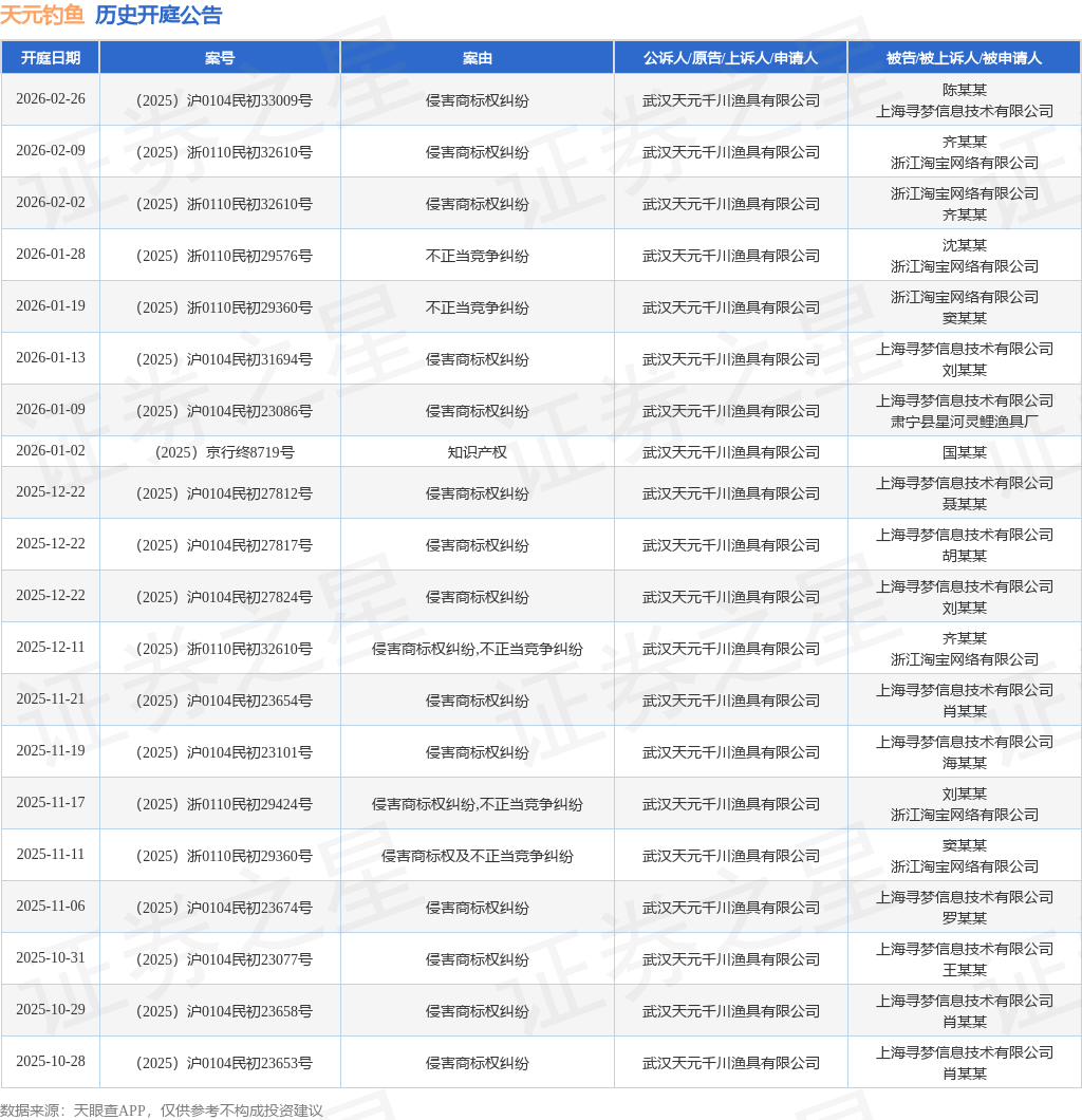 案号:(2025)浙0110民初29360号根据统计,近一年内以武汉天元千川渔具有限公司为当事人的历史开庭公告有93则,其中案由为“侵害商标权纠纷”的公告以59则居首,其次为“侵害作品复制权纠纷”有19则,“侵害作品发行权纠纷”有6则。历史开庭公告(前20条)如下: