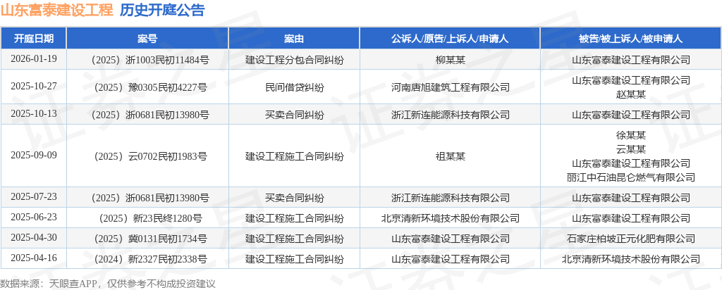 案号:(2025)浙1003民初11484号根据统计,近一年内以山东富泰建设工程有限公司为当事人的历史开庭公告有8则,其中案由为“建设工程施工合同纠纷”的公告以4则居首,其次为“买卖合同纠纷”有2则,“建设工程分包合同纠纷”有1则。历史开庭公告如下: