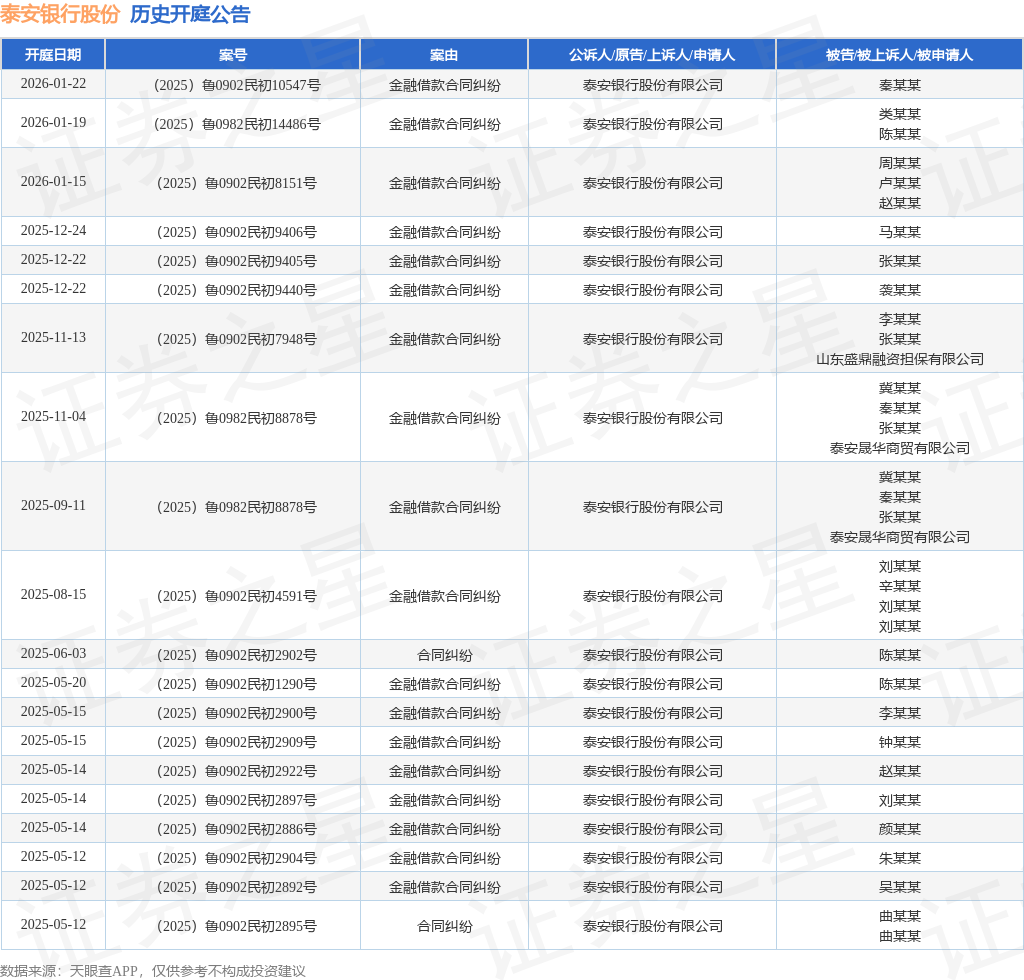证券之星消息,根据天眼查APP显示,近日公布了一则泰安银行股份有限公司作为原告/上诉人的开庭公告,详细内容如下: