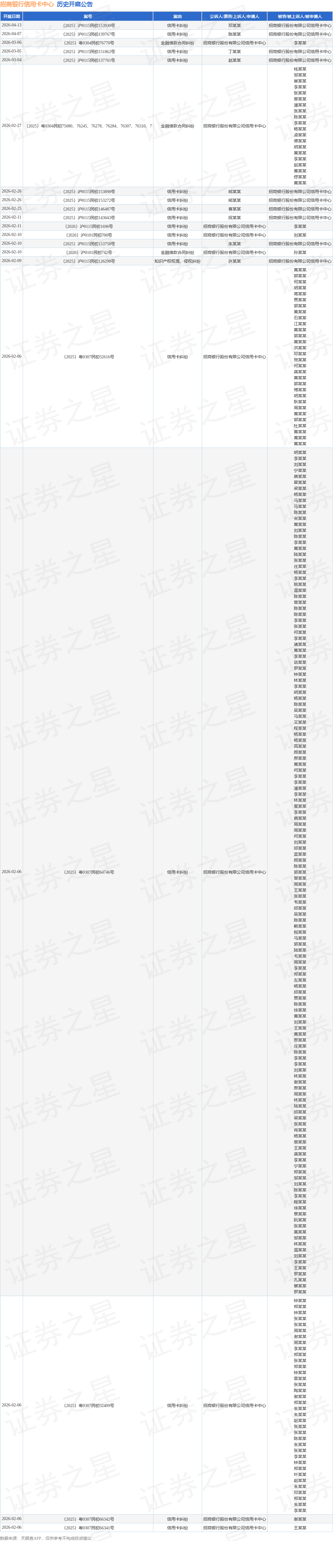 案号:(2025)沪0115民初134633号根据统计,近一年内以招商银行股份有限公司信用卡中心为当事人的历史开庭公告有11326则,其中案由为“信用卡纠纷”的公告以9312则居首,其次为“金融借款合同纠纷”有1892则,“小额借款合同纠纷”有30则。历史开庭公告(前20条)如下: