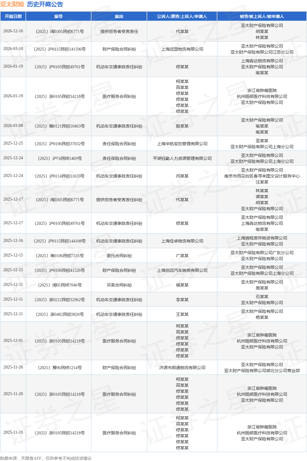 案号:(2025)沪0105民初49761号根据统计,近一年内以亚太财产保险有限公司为当事人的历史开庭公告有170则,其中案由为“机动车交通事故责任纠纷”的公告以79则居首,其次为“责任保险合同纠纷”有14则,“保险人代位求偿权纠纷”有13则。历史开庭公告(前20条)如下: