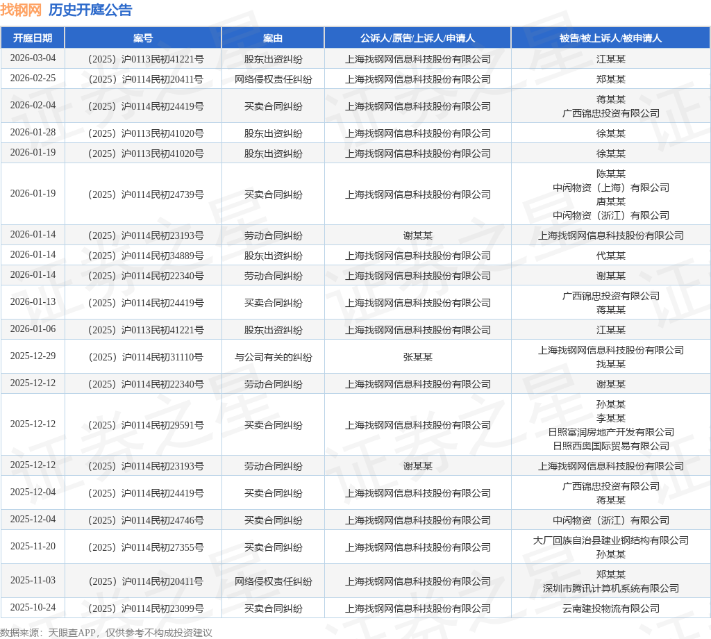 案号:(2025)沪0113民初41020号根据统计,近一年内以上海找钢网信息科技股份有限公司为当事人的历史开庭公告有59则,其中案由为“买卖合同纠纷”的公告以26则居首,其次为“劳动合同纠纷”有10则,“股东出资纠纷”有5则。历史开庭公告(前20条)如下:
