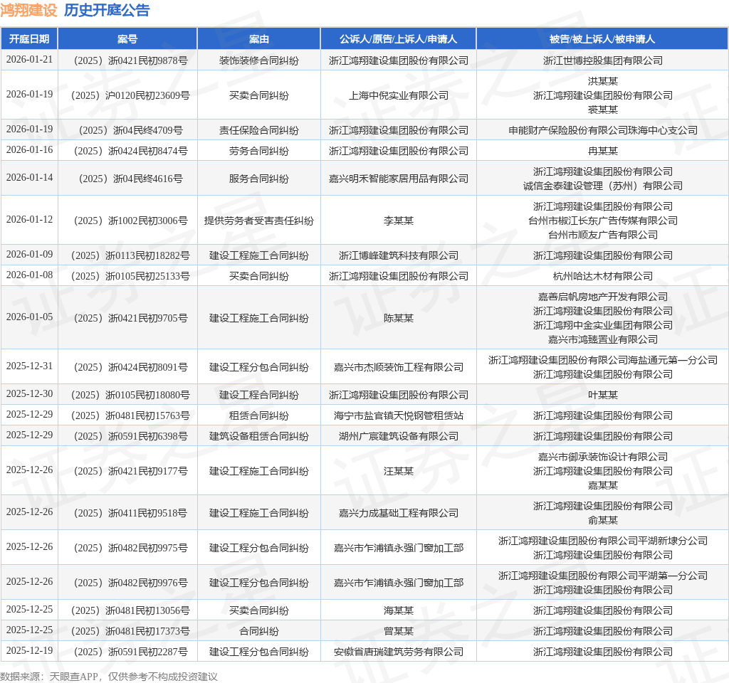 案号:(2025)沪0120民初23609号根据统计,近一年内以浙江鸿翔建设集团股份有限公司为当事人的历史开庭公告有231则,其中案由为“建设工程施工合同纠纷”的公告以52则居首,其次为“买卖合同纠纷”有36则,“建设工程分包合同纠纷”有26则。历史开庭公告(前20条)如下: