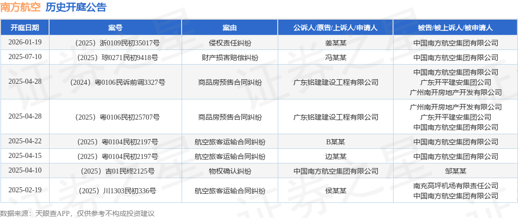案号:(2025)浙0109民初35017号根据统计,近一年内以中国南方航空集团有限公司为当事人的历史开庭公告有8则,其中案由为“航空旅客运输合同纠纷”的公告以3则居首,其次为“商品房预售合同纠纷”有2则,“侵权责任纠纷”有1则。历史开庭公告如下: