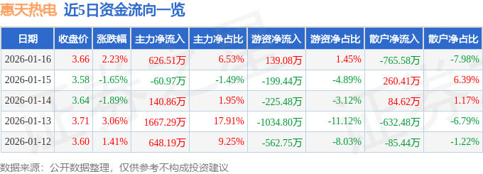 证券之星消息,截至2026年1月16日收盘,惠天热电(000692)报收于3.66元,上涨2.23%,换手率4.91%,成交量26.14万手,成交额9592.33万元。