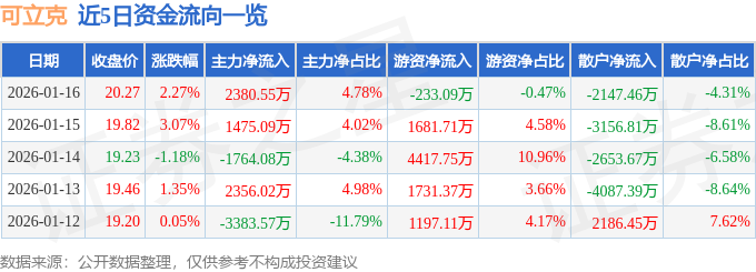 证券之星消息,截至2026年1月16日收盘,可立克(002782)报收于20.27元,上涨2.27%,换手率5.06%,成交量24.63万手,成交额4.98亿元。