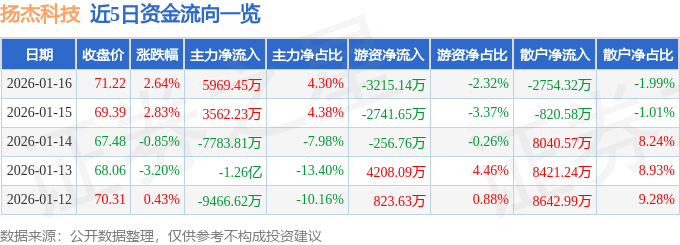 证券之星消息,截至2026年1月16日收盘,扬杰科技(300373)报收于71.22元,上涨2.64%,换手率3.61%,成交量19.57万手,成交额13.87亿元。