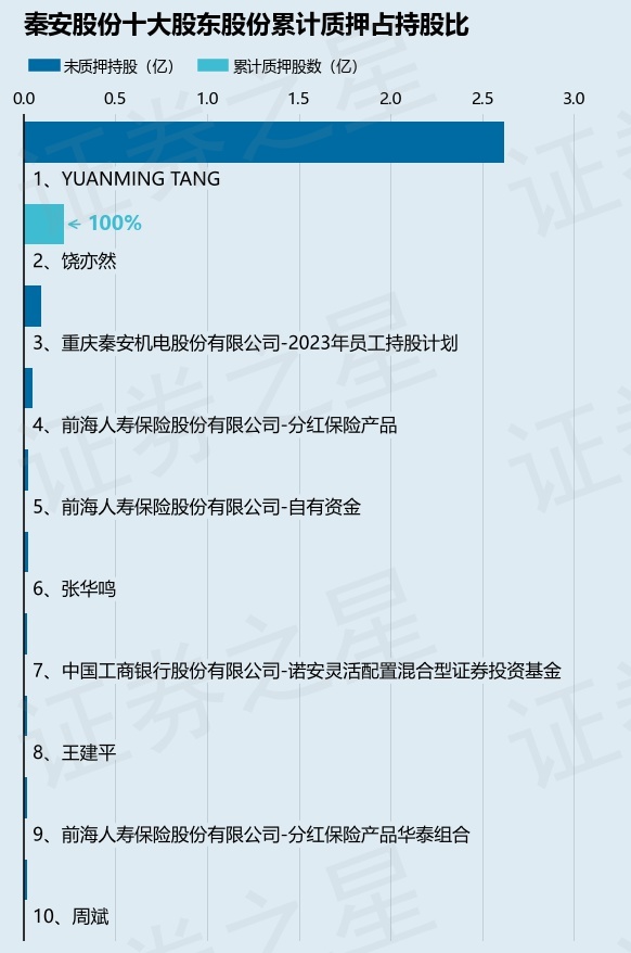 截止本公告日,股东饶亦然已累计质押股份2193.99万股,占其持股总数的100.0%。本次质押后秦安股份十大股东的累计质押股份占持股比例(占持股比例的计算以公司最新一期财务报表公布的十大股东的持股总数为基准)见下图:
