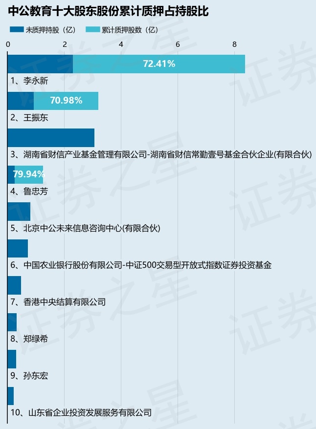截止本公告日,股东李永新已累计质押股份6.07亿股,占其持股总数的72.41%,股东王振东已累计质押股份2.27亿股,占其持股总数的70.98%,股东鲁忠芳已累计质押股份9965.0万股,占其持股总数的79.94%。本次质押后中公教育十大股东的累计质押股份占持股比例(占持股比例的计算以公司最新一期财务报表公布的十大股东的持股总数为基准)见下图: