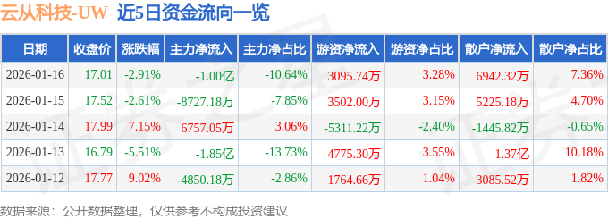证券之星消息,截至2026年1月16日收盘,云从科技(688327)报收于17.01元,下跌2.91%,换手率6.65%,成交量55.46万手,成交额9.44亿元。