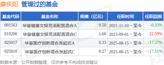 廖庆阳先生:中国国籍,复旦大学经济学硕士,硕士研究生学历。历任中泰证券股份有限公司投资顾问、海通证券股份有限公司分析师、天风证券股份有限公司高级分析师、凯盛融英(科技)股份有限公司医药行业负责人。2020年9月加入华富基金管理有限公司,曾任研究发展部基金经理助理、总监助理。担任华富基金管理有限公司投资决策委员会成员。2021年11月10日起担任华富健康文娱灵活配置混合型证券投资基金的基金经理。具有基金从业资格。