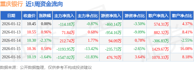 证券之星消息,截至2026年1月16日收盘,重庆银行(601963)报收于10.19元,较上周的10.45元下跌2.49%。本周,重庆银行1月13日盘中最高价报10.64元。1月16日盘中最低价报10.1元。重庆银行当前最新总市值354.06亿元,在城商行板块市值排名10/17,在两市A股市值排名585/5183。