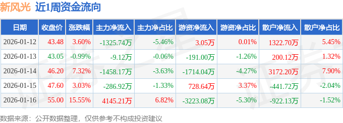 资金流向数据方面,本周新风光主力资金合计净流入1065.26万元,游资资金合计净流出4396.43万元,散户资金合计净流入3331.16万元。本周资金流向一览见下表: