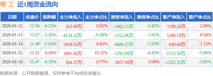 证券之星消息,截至2026年1月16日收盘,柳 工(000528)报收于11.47元,较上周的11.97元下跌4.18%。本周,柳 工1月13日盘中最高价报12.01元。1月14日盘中最低价报11.41元。柳 工当前最新总市值233.53亿元,在工程机械板块市值排名8/28,在两市A股市值排名908/5183。
