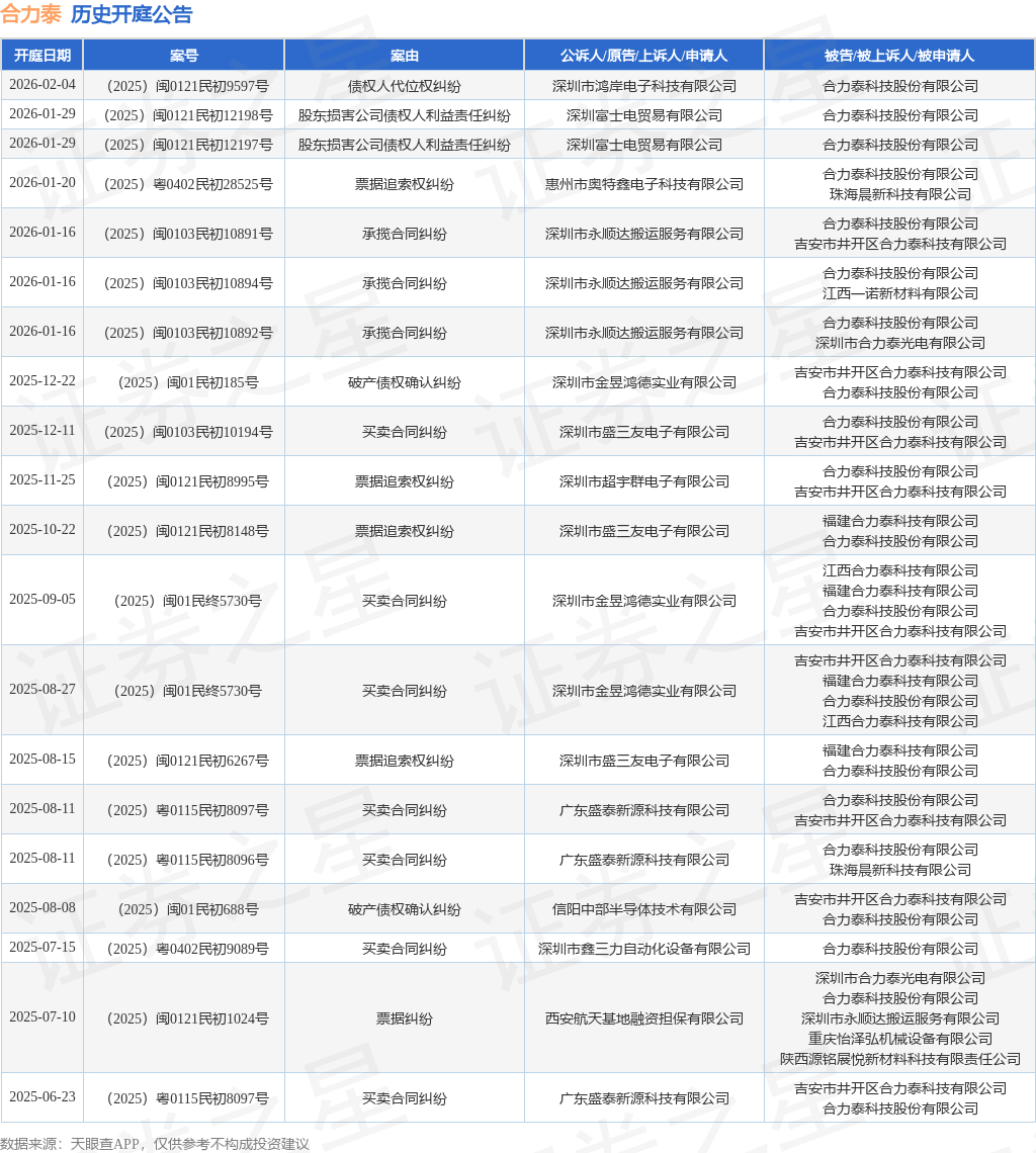案号:(2025)粤0402民初28525号根据统计,近一年内以合力泰科技股份有限公司为当事人的历史开庭公告有49则,其中案由为“买卖合同纠纷”的公告以18则居首,其次为“票据纠纷”有10则,“票据追索权纠纷”有7则。历史开庭公告(前20条)如下: