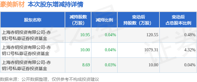 证券之星消息,1月18日豪美新材发布公告《豪美新材:关于持股5%以上股东减持计划实施完毕的公告》,其股东上海赤钥投资有限公司-赤钥2号私募证券投资基金、上海赤钥投资有限公司-赤钥12号私募证券投资基金、上海赤钥投资有限公司-赤钥5号私募证券投资基金于2026年1月8日至2026年1月16日间合计减持29.64万股,占公司目前总股本的0.1186%,变动期间该股股价上涨1.69%,截止1月16日收盘报39.74元。