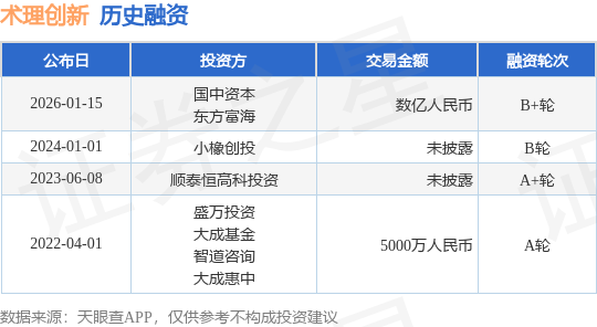 证券之星消息,根据天眼查APP于1月15日公布的信息整理,上海术理智能科技有限公司B+轮融资,融资额数亿人民币,参与投资的机构包括国中资本,东方富海。