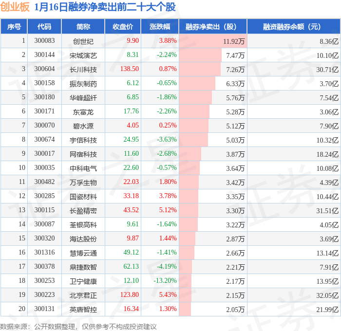 创业板融券净卖出前三分别为:创世纪(300083)融券净卖出11.92万股、宋城演艺(300144)融券净卖出7.47万股、长川科技(300604)融券净卖出7.26万股,前20具体见下表: