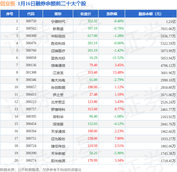 创业板融券余额前三分别为:宁德时代(300750)融券余额1.21亿元、新易盛(300502)融券余额7031.06万元、中际旭创(300308)融券余额5936.77万元,前20具体见下表: