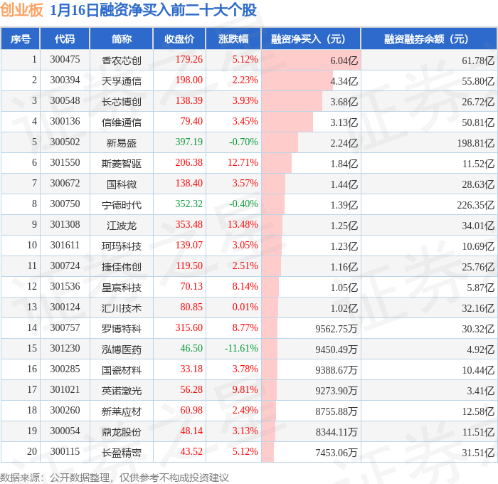 创业板融资净买入前三分别为:香农芯创(300475)融资净买入6.04亿元、天孚通信(300394)融资净买入4.34亿元、长芯博创(300548)融资净买入3.68亿元,前20具体见下表: