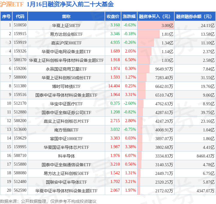 沪深ETF融资净买入前三分别为:华夏上证50ETF(510050)融资净买入3亿元、易方达创业板ETF(159915)融资净买入1.81亿元、嘉实沪深300ETF(159919)融资净买入1.34亿元,前20具体见下表: