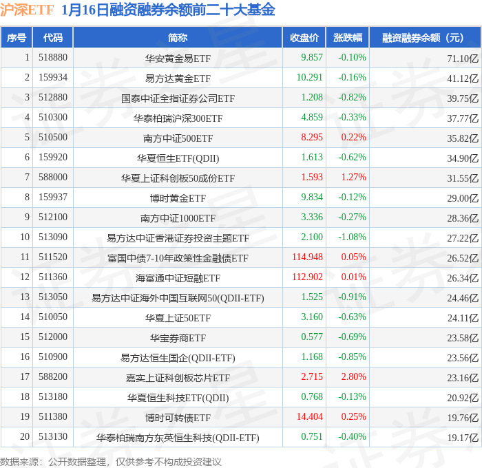 沪深ETF融资融券余额前三分别为:华安黄金易ETF(518880)融资融券余额71.1亿元、易方达黄金ETF(159934)融资融券余额41.12亿元、国泰中证全指证券公司ETF(512880)融资融券余额39.75亿元,前20具体见下表: