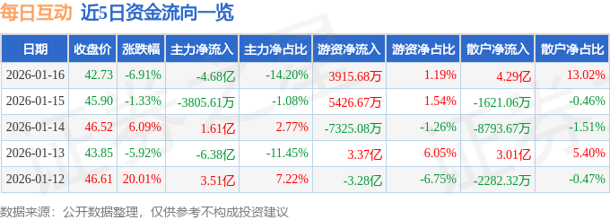 证券之星消息,截至2026年1月16日收盘,每日互动(300766)报收于42.73元,下跌6.91%,换手率20.74%,成交量74.28万手,成交额32.96亿元。
