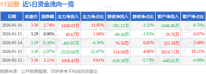 1月16日的资金流向数据方面,主力资金净流入1438.02万元,占总成交额11.95%,游资资金净流出391.15万元,占总成交额3.25%,散户资金净流出1046.86万元,占总成交额8.7%。
