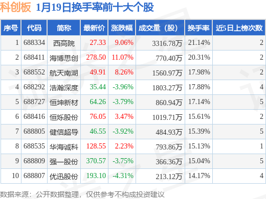 当日科创板换手率前10大个股中5只个股收涨,平均涨幅6.82%,其中西高院(688334)以换手率21.14%排第一,9只个股近5个交易日中多次上榜。