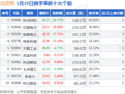 当日北交所换手率前10大个股中7只个股收涨,平均涨幅11.08%,其中科马材料(920086)以换手率62.05%排第一,9只个股近5个交易日中多次上榜。