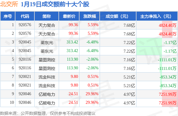 当日北交所成交额前10大个股中6只个股收涨,平均涨幅12.02%,其中天力复合(920576)以成交额7.68亿元排第一。从主力资金流入看,成交额前10大个股中有4只个股呈现主力资金净流入。
