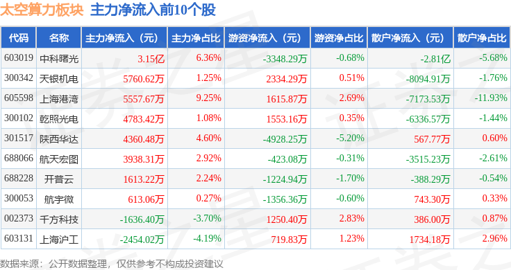 从资金流向上来看,当日太空算力板块主力资金净流出16.99亿元,游资资金净流入4.13亿元,散户资金净流入12.86亿元。太空算力板块个股资金流向见下表: