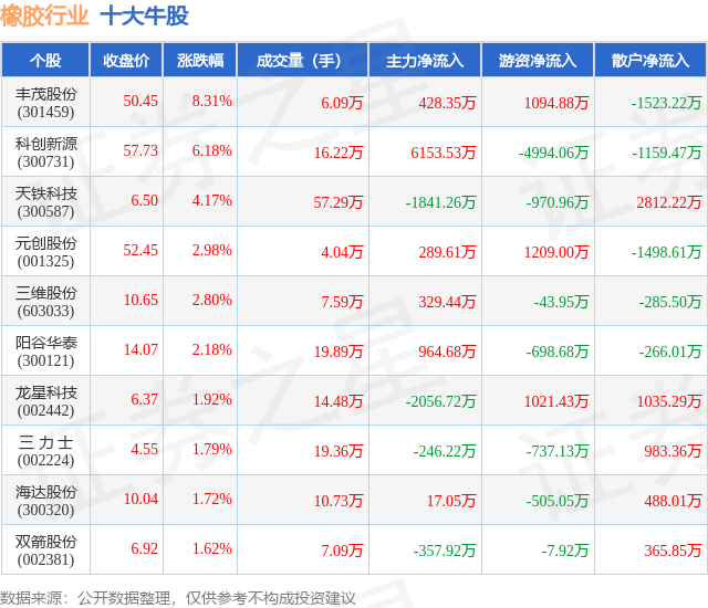 个股表现方面,橡胶行业当日领涨股为丰茂股份(301459),该股当日报收50.45,上涨8.31%,成交量6.09万,主力资金净流入428.35万元。科创新源(300731)以上涨6.18%紧随其后,该股当日成交量16.22万,主力资金净流入6153.53万元。除此之外,天铁科技(300587)、元创股份(001325)、三维股份(603033)均进入当日牛股之列。具体个股列表见下表: