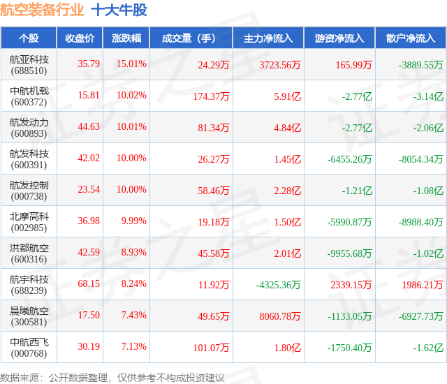 个股表现方面,航空装备行业当日领涨股为航亚科技(688510),该股当日报收35.79,上涨15.01%,成交量24.29万,主力资金净流入3723.56万元。中航机载(600372)以上涨10.02%紧随其后,该股当日成交量174.37万,主力资金净流入5.91亿元。除此之外,航发动力(600893)、航发科技(600391)、航发控制(000738)均进入当日牛股之列。具体个股列表见下表: