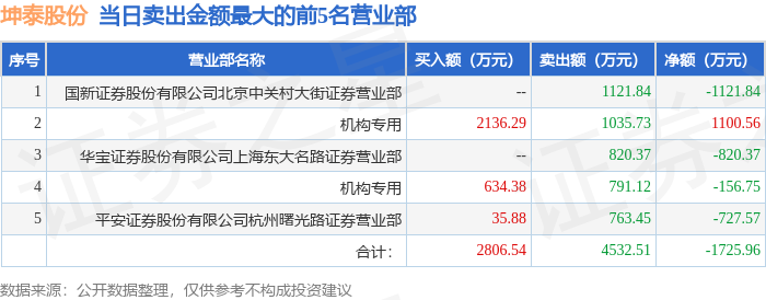证券之星消息,沪深交易所2026年1月19日公布的交易公开信息显示,坤泰股份(001260)因日振幅值达到15%的前5只证券,日换手率达到20%的前5只证券登上龙虎榜。此次是近5个交易日内第3次上榜。