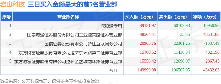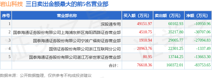 证券之星消息,沪深交易所2026年1月19日公布的交易公开信息显示,岩山科技(002195)因连续三个交易日内,跌幅偏离值累计达到20%的证券登上龙虎榜。此次是近5个交易日内第3次上榜。