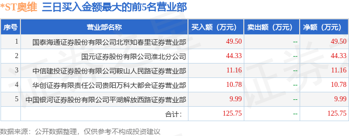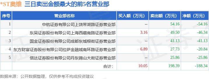 证券之星消息,沪深交易所2026年1月19日公布的交易公开信息显示,*ST奥维(002231)因连续三个交易日内,跌幅偏离值累计达到12%的ST证券、*ST证券和未完成股改证券登上龙虎榜。此次是近5个交易日内第2次上榜。