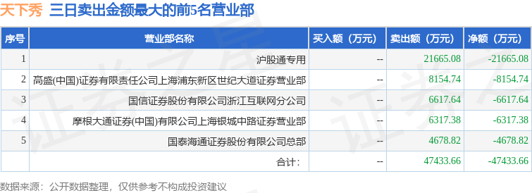 证券之星消息,沪深交易所2026年1月19日公布的交易公开信息显示,天下秀(600556)因非ST、*ST和S证券连续三个交易日内收盘价格跌幅偏离值累计达到20%的证券登上龙虎榜。此次是近5个交易日内第2次上榜。