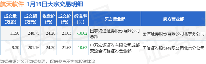 证券之星消息,1月19日航天软件发生大宗交易,交易数据如下: