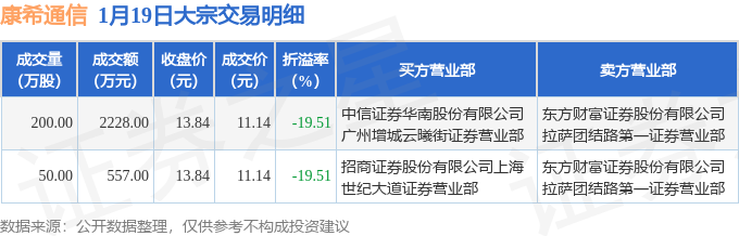 证券之星消息,1月19日康希通信发生大宗交易,交易数据如下: