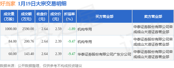 证券之星消息,1月19日好当家发生大宗交易,交易数据如下: