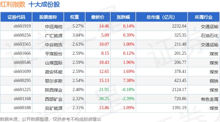 证券之星消息,1月19日,红利指数(000015)报收于3034.76点,涨0.53%,成交330.02亿元,换手率0.24%。当日该指数成份股中,上涨的有29家,鄂尔多斯以7.38%的涨幅领涨,下跌的有16家,渝农商行以3.15%的跌幅领跌。