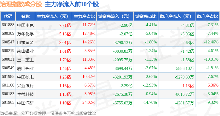 资金流向方面,治理指数(000019)成份股当日主力资金净流出合计33.04亿元,游资资金净流入合计1.94亿元,散户资金净流入合计31.1亿元。成份股资金流向详情见下表: