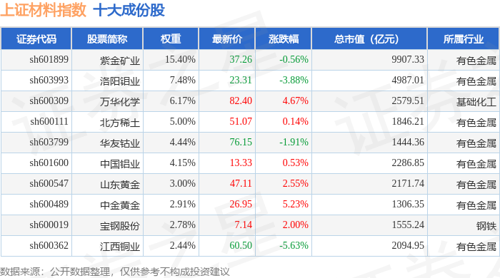 证券之星消息,1月19日,上证材料(000033)指数报收于4051.02点,涨0.96%,成交986.44亿元,换手率2.76%。当日该指数成份股中,上涨的有38家,昊华科技以10.0%的涨幅领涨,下跌的有10家,江西铜业以5.63%的跌幅领跌。