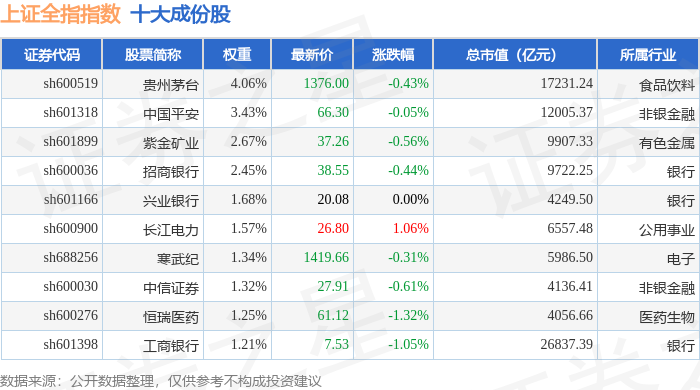 上证全指(000047)指数十大成份股详情如下:
