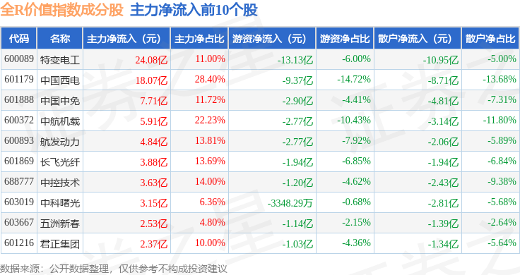 资金流向方面,全R价值(000060)指数成份股当日主力资金净流出合计51.09亿元,游资资金净流出合计8.42亿元,散户资金净流入合计59.52亿元。成份股资金流向详情见下表: