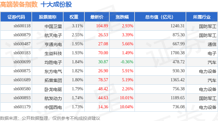 证券之星消息,1月19日,高端装备(000097)指数报收于12680.34点,涨1.09%,成交2395.14亿元,换手率2.85%。当日该指数成份股中,上涨的有33家,中国西电以10.04%的涨幅领涨,下跌的有27家,佰维存储以4.74%的跌幅领跌。