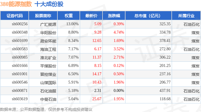 证券之星消息,1月19日,380能源(000104)指数报收于1338.31点,涨1.57%,成交49.92亿元,换手率1.1%。当日该指数成份股中,上涨的有16家,华阳股份以4.74%的涨幅领涨。